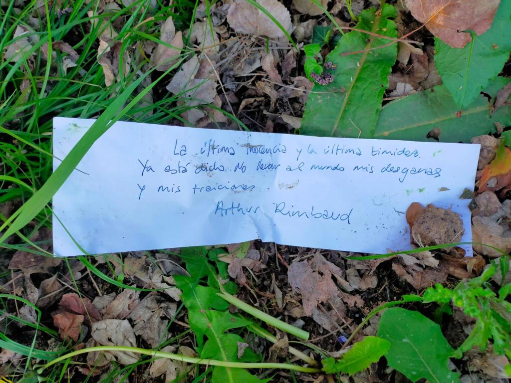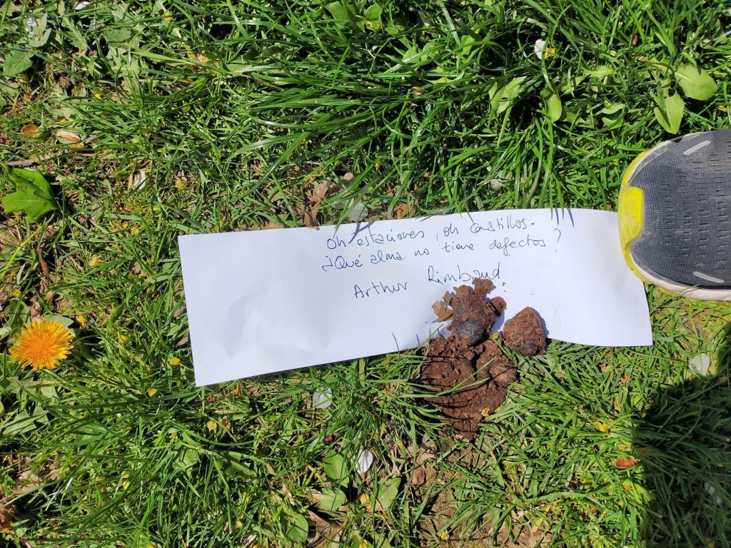 "Mientras los fondos públicos se derrochan en fiestas de fraternidad, suena una campana de fuego rosa en las nubes", puede leerse en otro de los versos que anuncian la presencia de una mierda de perro sobre el césped. En el papel aparece la firma del autor del poema –siempre Rimbaud– a veces camuflada por la deyección. Pero no hay pistas del anónimo seguidor de los versos del francés. Tampoco la única pista sólida de la fechoría conduce al incívico dueño de la mascota. Mucho Rimbaud, mucha mierda, mucha poesía y dos misterios sin resolver.