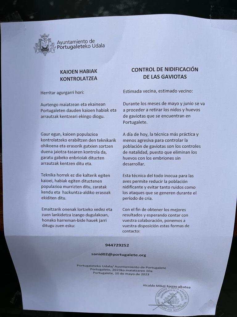 Como en años anteriores, desde el área de Servicios y Medio Ambiente del Ayuntamiento de Portugalete vuelven a poner en marcha una nueva campaña del programa municipal de control de las gaviotas.