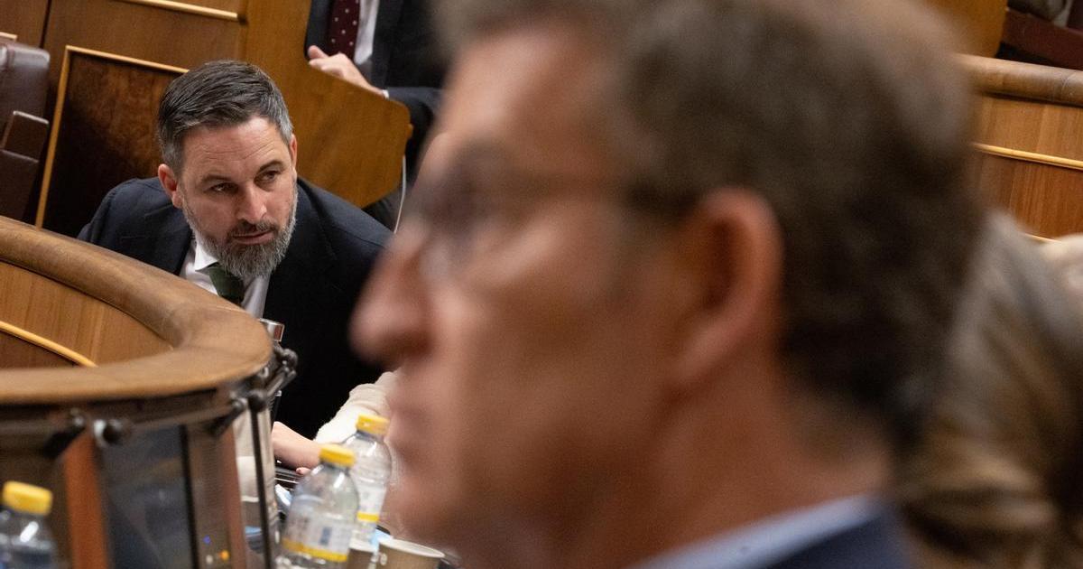 Santiago Abascal. al fondo, en una sesión del Congreso de los Diputados con Alberto Núñez Feijóo en primer plano.
