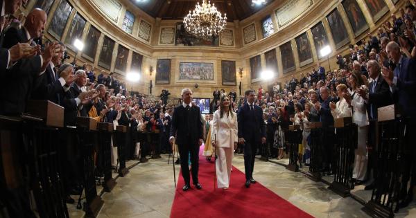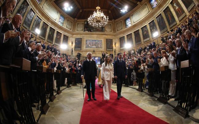 La Banda de Música de la Ertzaintza pasó a interpretar el 'Euzko-Abendaren Ereserkia' y, a continuación, el lehendakari se ha ubicado ante la verja que limita el recinto del venerado roble foral para presenciar el aurresku de honor, tras el cual los protagonistas han vuelto a la Sala de Juntas, en el que predominaba el azul en los trajes masculinos y las variantes del blanco en los femeninos. El secretario primero ha dado lectura a los artículos 24 y 33 del Estatuto de Autonomía y el lehendakari Pradales se ha dirigido a la tribuna de oradores, desde donde ha pronunciado la fórmula de asunción del cargo para recoger la makila. "Por voluntad del Parlamento Vasco, prestado el juramento, tomo posesión y asumo el cargo de lehendakari del Gobierno del País Vasco, así como de la condición de representante ordinario del Estado, de acuerdo al ordenamiento jurídico", ha afirmado. El 'Agur Jaunak' ha cerrado la sesión para abrir una nueva era en la que llama a tender puentes y reconectar con la sociedad.