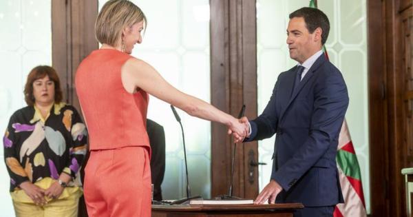 La consejera de Autogobierno, Maria Ubarretxena, dando la mano al lehendakari Pradales en su toma de posesión / Irekia