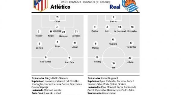 La Real visita hoy a un Atlético cuyas incógnitas previas al partido se centran en la zaga. Para el eje de la misma, la plantilla colchonera cuenta con Giménez, Felipe, Hermoso y Savic, pero este último está lesionado y tiene muy difícil entrar hoy en la convocatoria. Si a ello le sumamos que Simeone suele apostar por tres centrales en la alineación, la nómina global podría quedarse corta. Aunque siempre existe la opción de dibujar una retaguardia de cuatro, opción a la que el argentino apuntó durante el entrenamiento del viernes. Imanol no se fía, dice que Simeone es muy zorro y posiblemente haya preparado el duelo pensando en un rival con su estructura de siempre. Es decir, con Trippier y Carrasco en los carriles largos. Koke, Lemar y De Paul están funcionado en la sala de máquinas. Y, tal y como sucediera ante el Barcelona hace tres semanas, Griezmann podría quedar fuera del ataque, ya que Suárez fue suplente ante el Liverpool y Joao Felix está rindiendo a gran nivel.