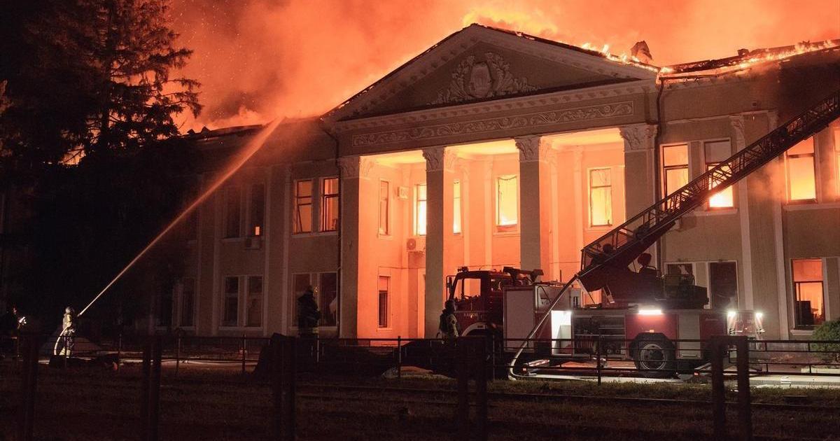 Los bomberos de Ucrania tratan de apagar un incendio en un edificio gubernamental en Járkov tras un ataque ruso. / EP