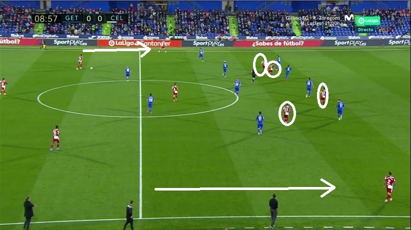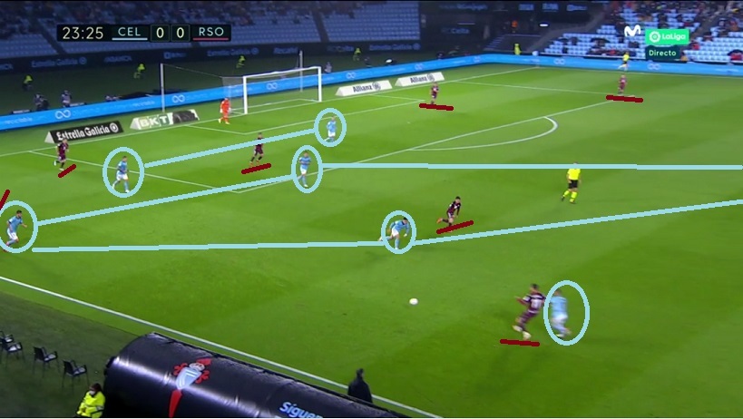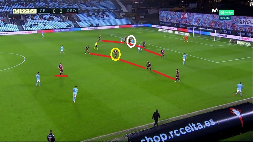 Pero con el paso de los minutos el míster optó de nuevo por una doble pantalla (dos pivotes centrales) delante de Aspas-Mina. Así, cambió a 5-4-1 con Turrientes (ahora en dcha) y Lobete defendiendo las bandas y Zubimendi-Merino dentro.