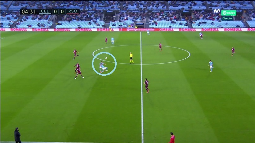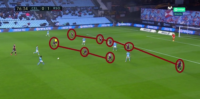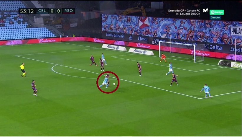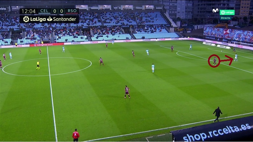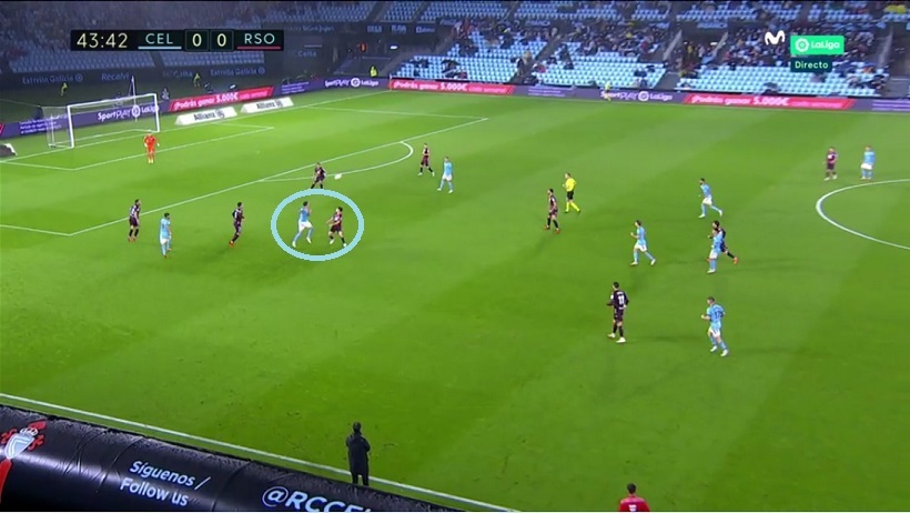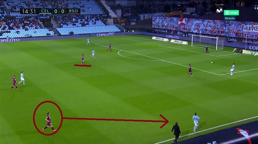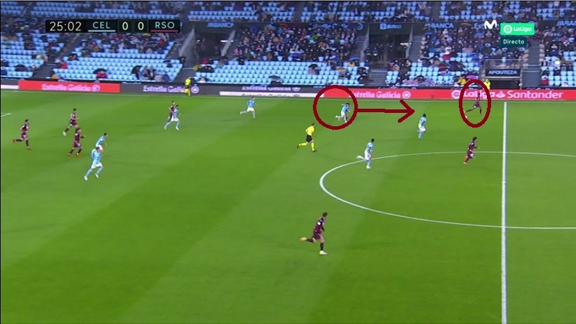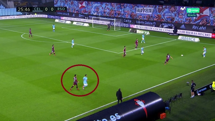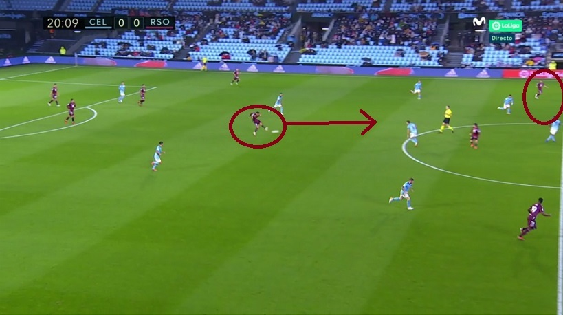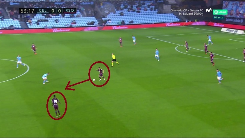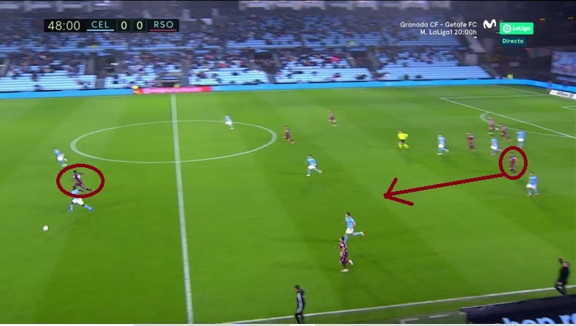 Resumimos panorama. El Celta no dejaba salir a la Real y le hacía sufrir sin balón, por mucho que, ya sin el esférico, los txuri-urdin hicieran cosas bien a la hora de defender. El equipo de Imanol necesitaba añadir a esto último algo de amenaza. La encontró al espacio.