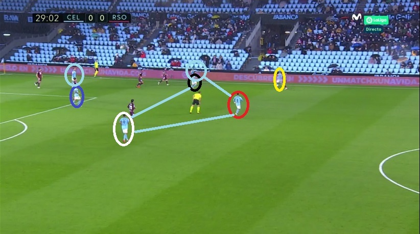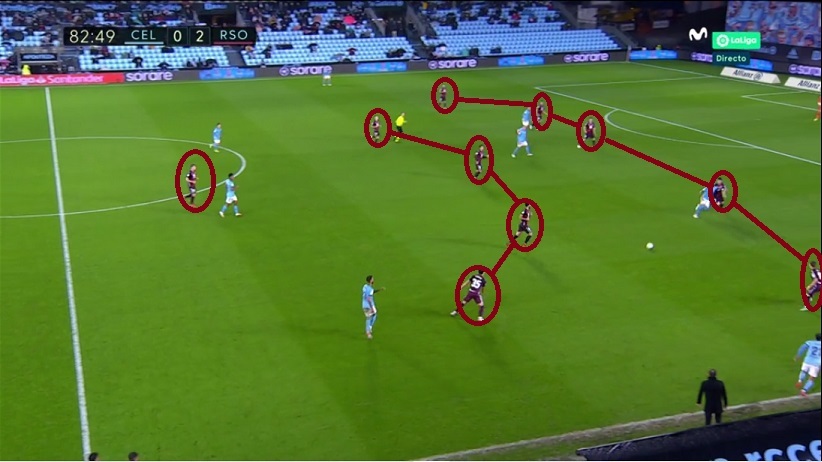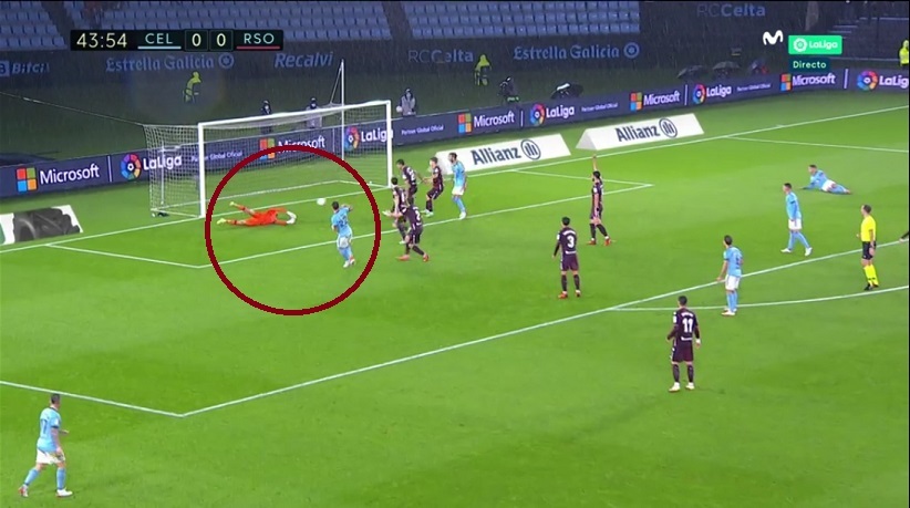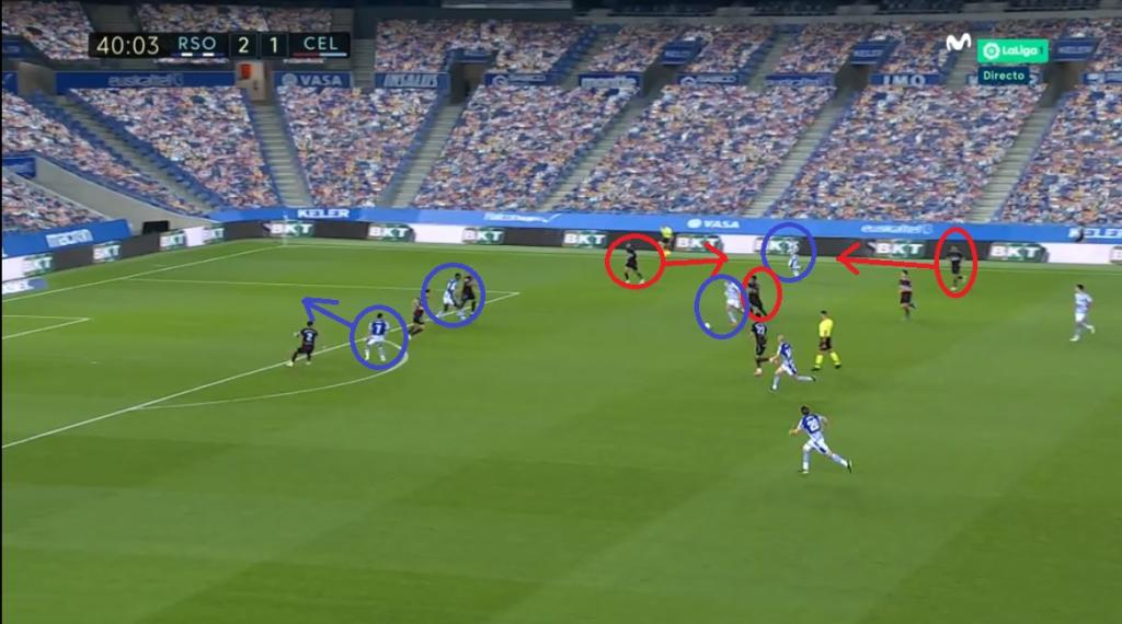 Y así nos plantamos en la acción del 0-1, que tampoco respondió a la casualidad. Arranca con un robo de Merino a Aspas en esa posición en que veíamos antes al navarro, como pivote izquierdo dispuesto a ayudar fuera.