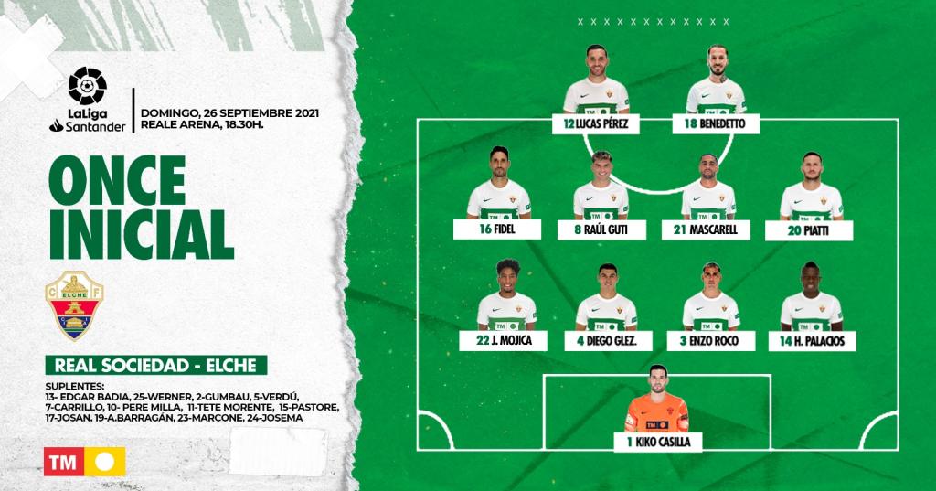 Fran Escribá, técnico del Elche, venía empleando una defensa de cinco, con tres centrales y dos carrileros, dentro de un claro 5-3-2 En Anoeta, mientras, cambió a un 4-4-2 que delataba la hoja de alineaciones. Así colocaban en el club a los futbolistas franjiverdes...