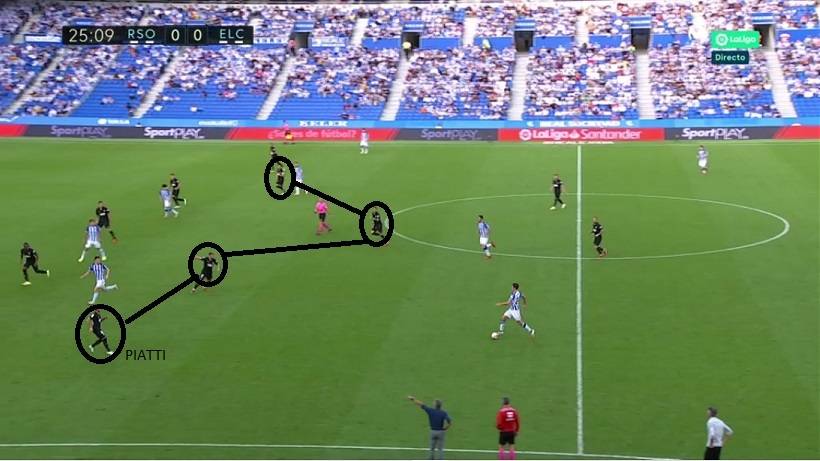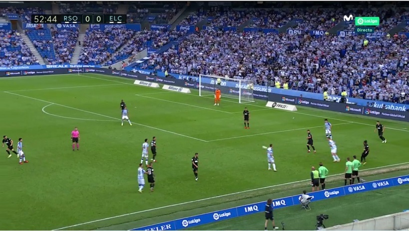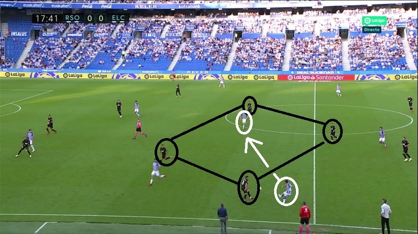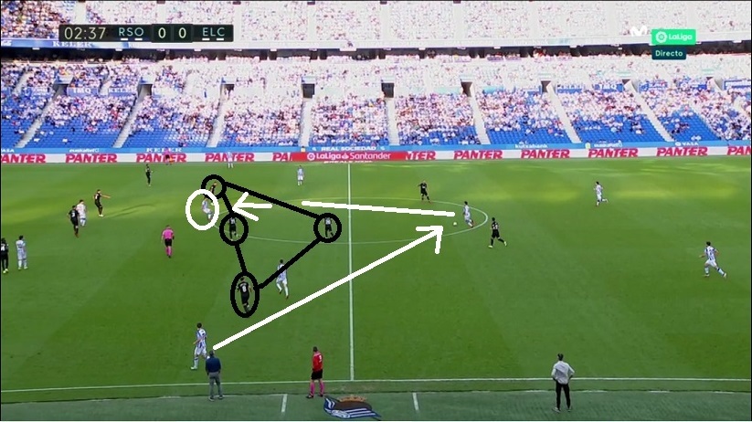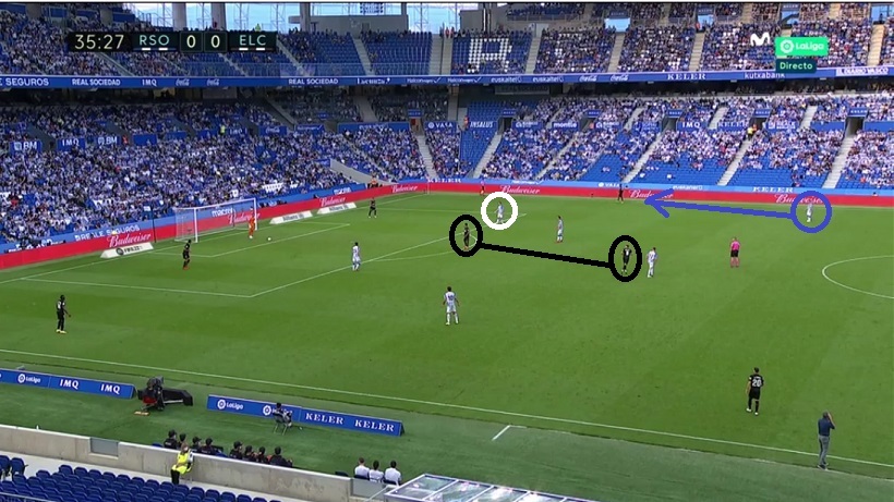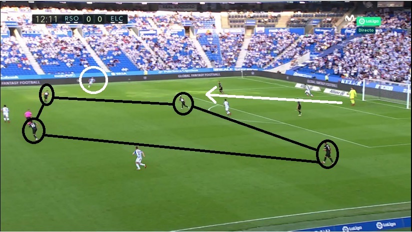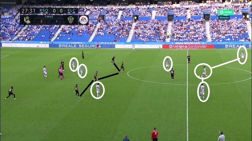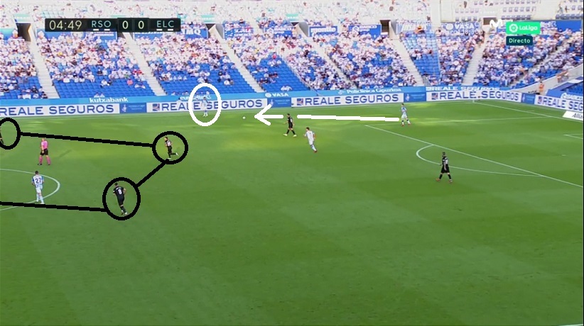 Adaptada la Real a la nueva estructura del Elche, los emparejamientos uno para uno más naturales facilitaron la presión y generaron varias oportunidades claras, como la de Oyarzabal tras forzarse el error visitante apretando como refleja la imagen inferior.