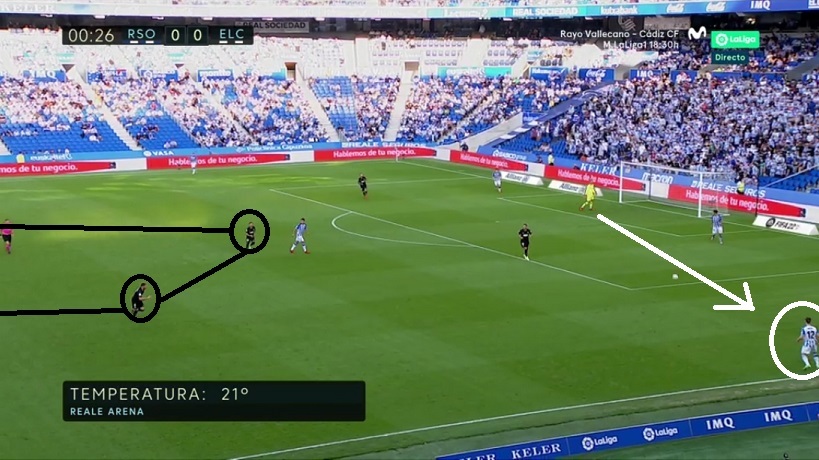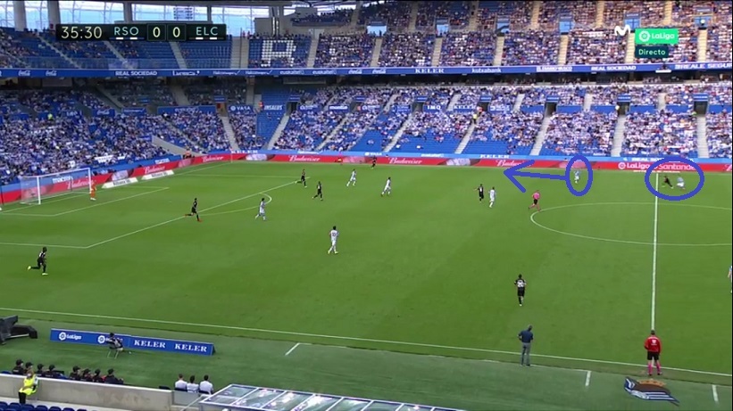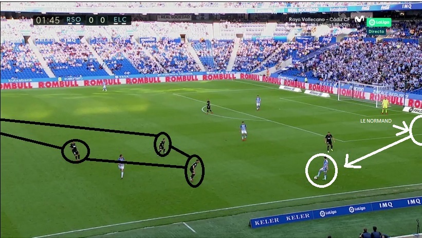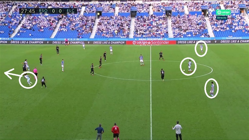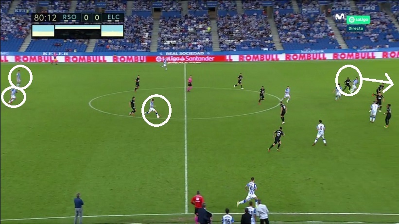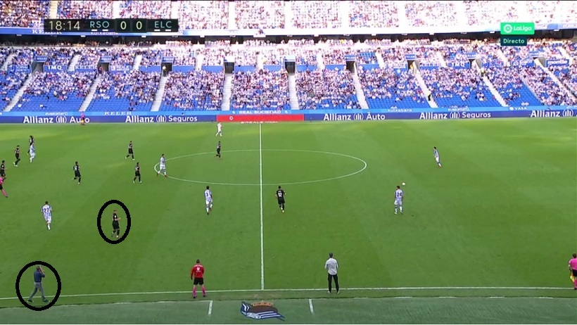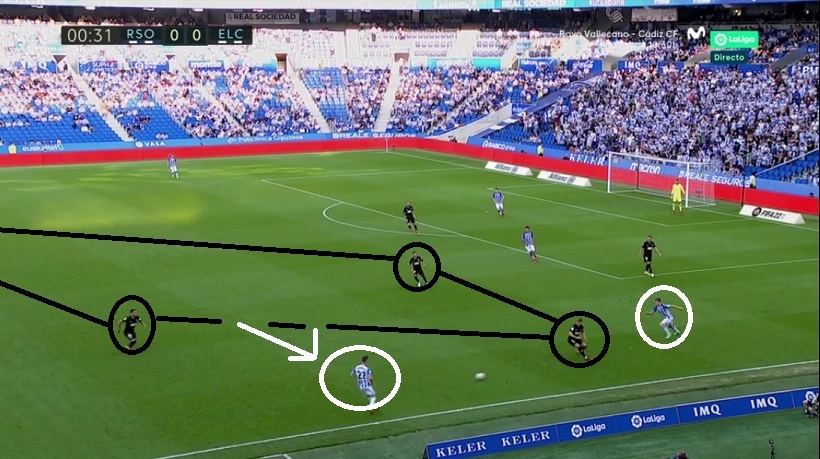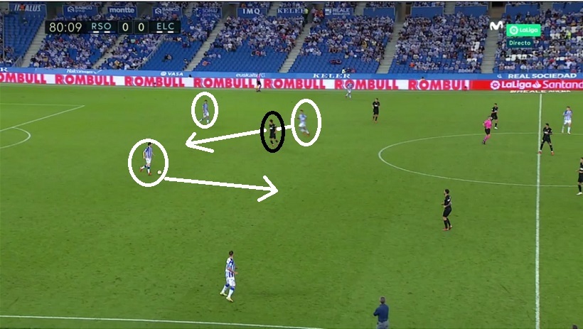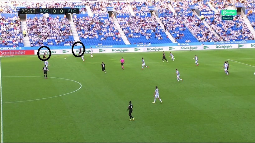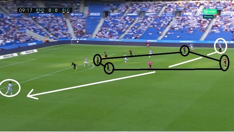 A su vez, esto obliga a corregir atrás, donde es Zubimendi quien tiene que retrasarse y escorarse a lateral derecho para vigilar al propio Fidel, ahora extremo. El Elche aprovechó esta fase del partido para asentarse en el mismo y amenazar la portería de Remiro