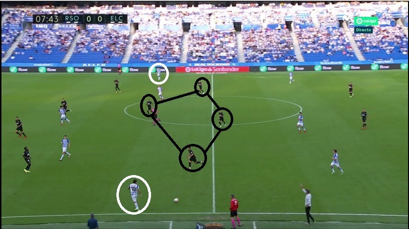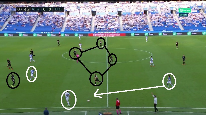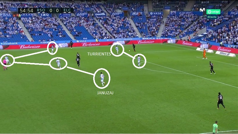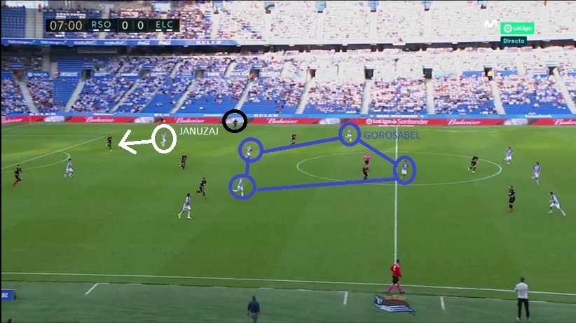 A los txuri-urdin les costó así hacer daño al rival. Y les costó igualmente ajustarse en la presión. Ante el rombo inicial del Elche, habían empezado el partido soltando a Januzaj a central y dibujando otro rombo en la medular, con Gorosabel en el vértice derecho (el lateral Mojica quedaba flotado)