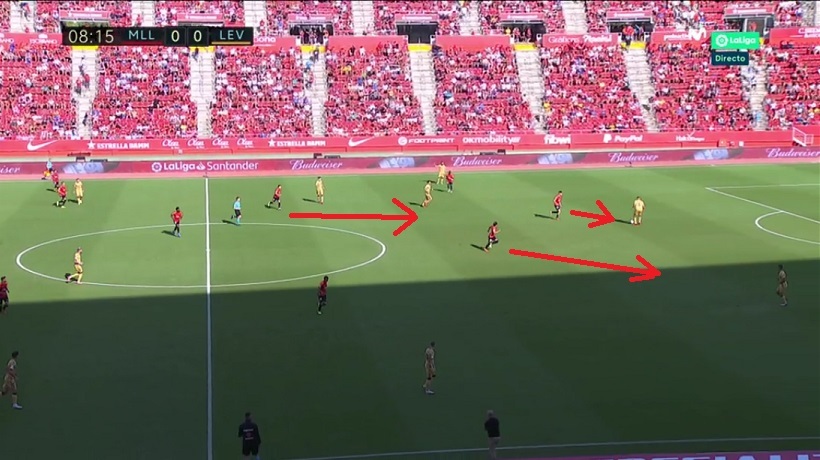 Antes, los de Imanol habían probado distintas fórmulas para intentar meter mano a un adversario más conservador que de costumbre. Y es que, una vez más, un visitante vino a Anoeta matizando su plan y mostrándose más prudente que de costumbre. En la imagen inferior vemos al Mallorca en la jornada anterior, ante el Levante, soltando a varios futbolistas para defender hacia adelante.