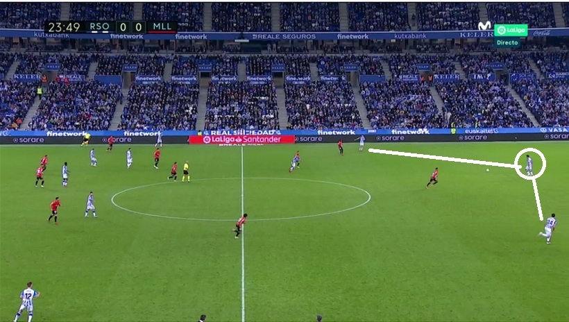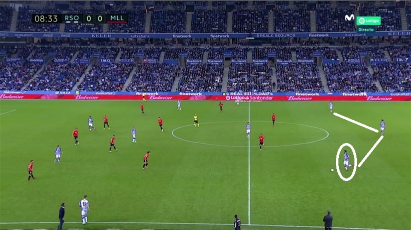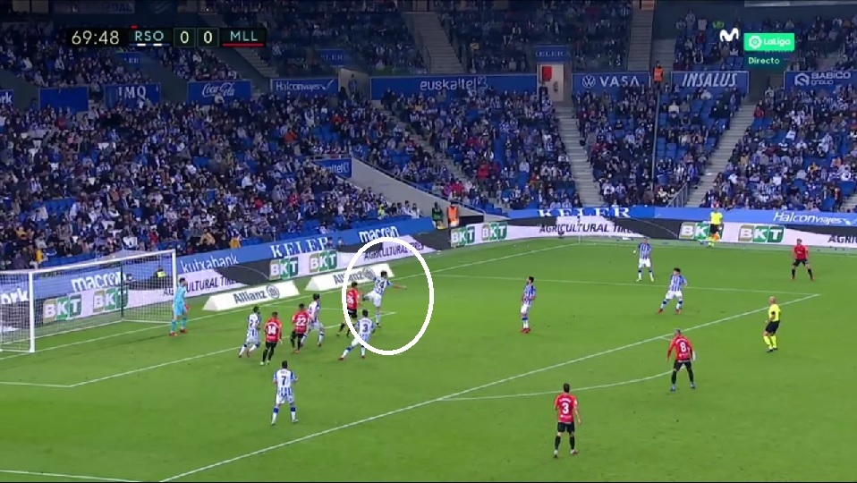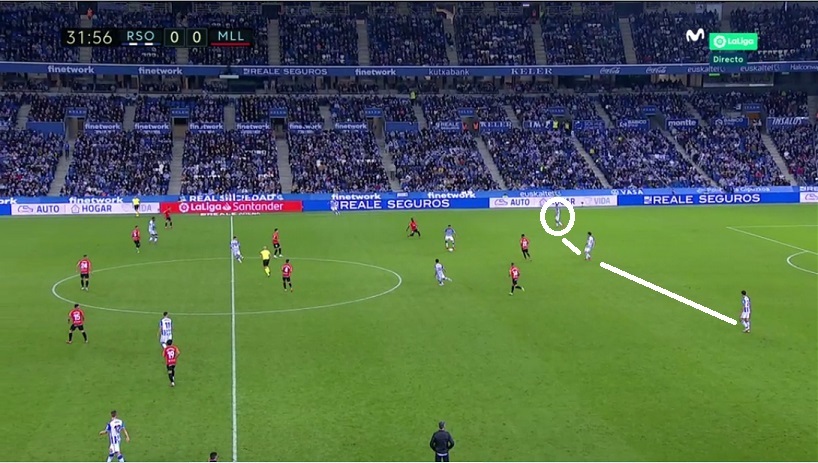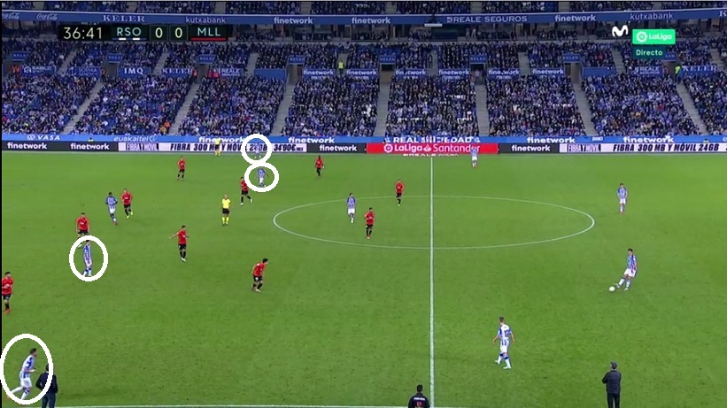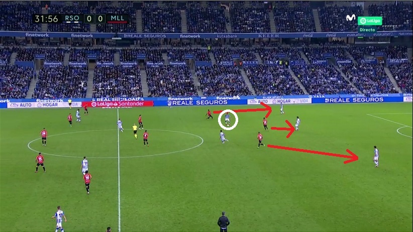 4- Apostando por la amplitud mediante centrales abiertos, extremos pisando la cal, e interiores profundos y altos (se aprecia en la imagen inferior el intercambio de perfiles entre Merino-Navarro y Januzaj-Portu).