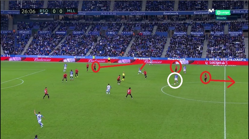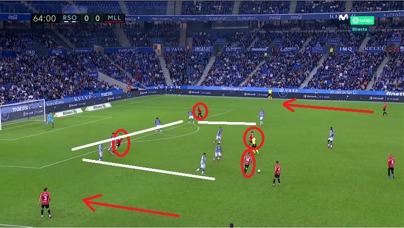 Y en esta segunda imagen vemos (líneas blancas) cómo el bloque realista tuvo que comprimirse y estrecharse para tapar dentro. Era lo que procedía ante un Mallorca que juntaba en zona interior a los dos puntas y a los dos extremos (círculos), y que dejaba toda la banda a los laterales (flechas).