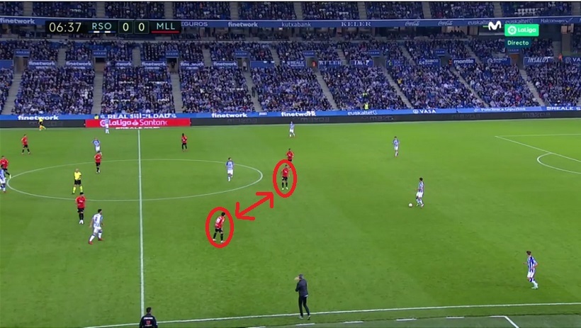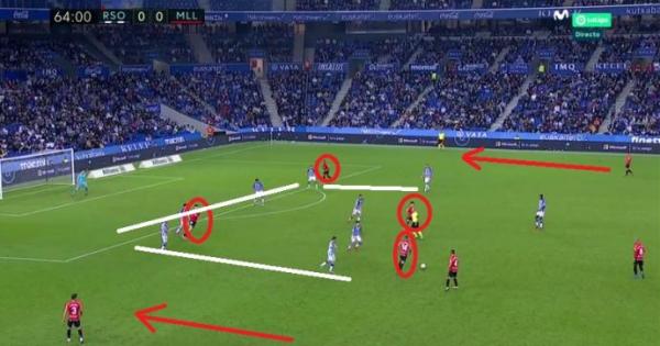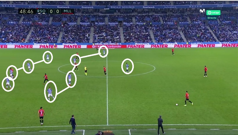 El bloque del Mallorca intentó ser corto y estrecho, dando prioridad a taponar el juego interior de la Real y a evitar generar pasillos entre líneas yendo a la presión alta. Así actuaron los de Luis Gracía: