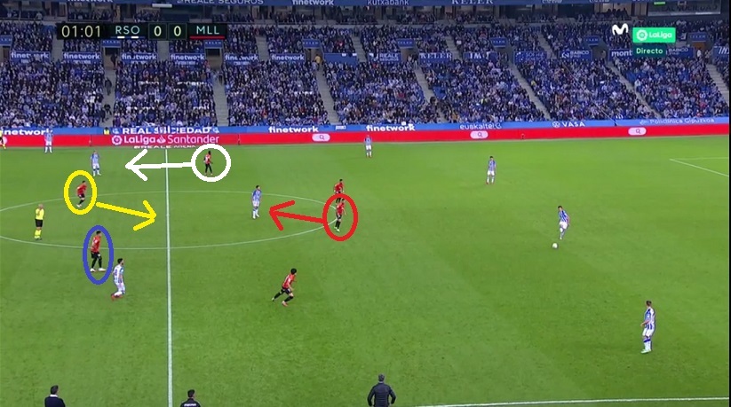 La Real encontró muchos problemas para avanzar en los primeros minutos, ante un rival que, manteniendo estructura y futbolistas, cambió sobre todo en cuanto a actitud. Sin embargo, la riqueza táctica txuri-urdin a la que suele aludir Imanol no tardó en aparecer. Y es que la Real intentó provocar una presión más agresiva del rival, mediante fórmulas muy diversas.
