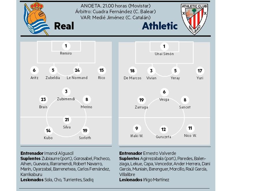 Guevara se suma a Sola, Turrientes y Sadiq a una lista de bajas médicas que, en el caso del Athletic, se ve reducida a la de la ausencia de Iñigo Martínez. El defensa ondarrutarra no ha podido recuperarse a tiempo de una incómoda fascitis plantar y se pierde un derbi que apuntaba a ser el último para él en Anoeta. Termina contrato el 30 de junio y no hay noticias sobre su renovación.