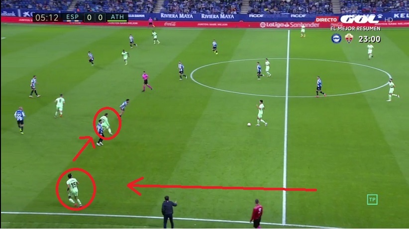 Imanol tuvo muy en cuenta este movimiento habitual de Muniain. Partiendo de la banda izquierda, acostumbra a centrar su posición y deja todo el carril para el lateral (Lekue en la imagen inferior, ante el Espanyol).
