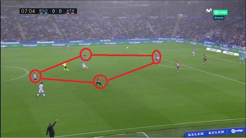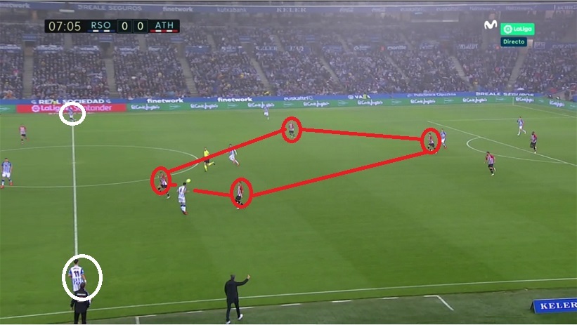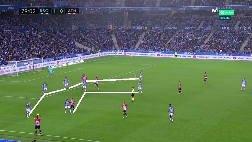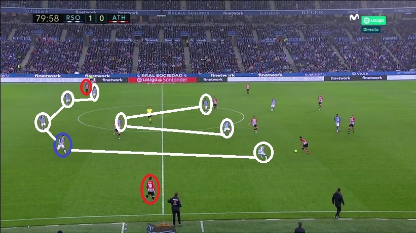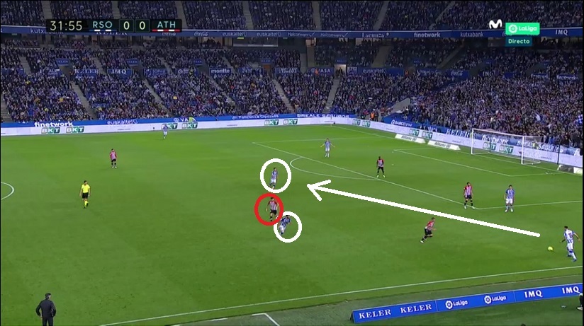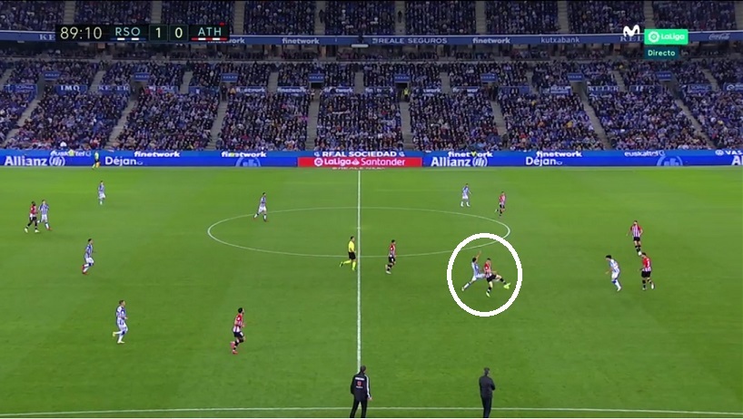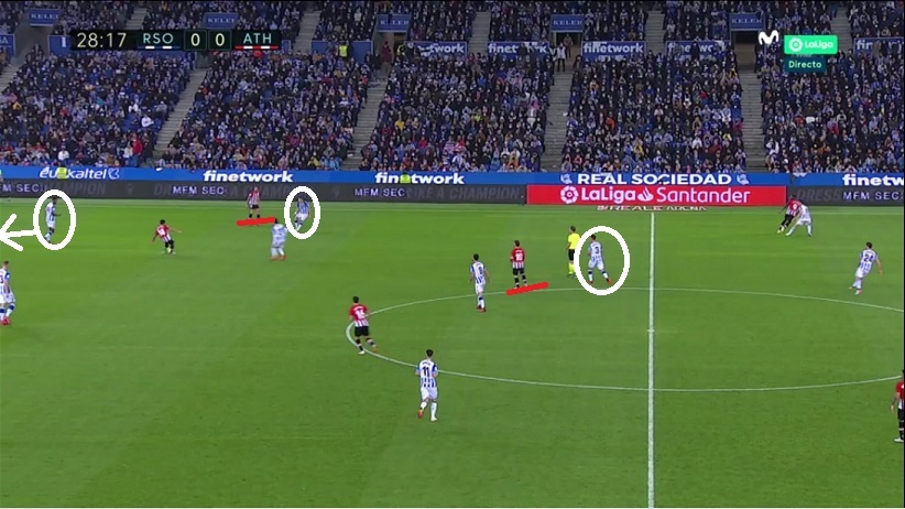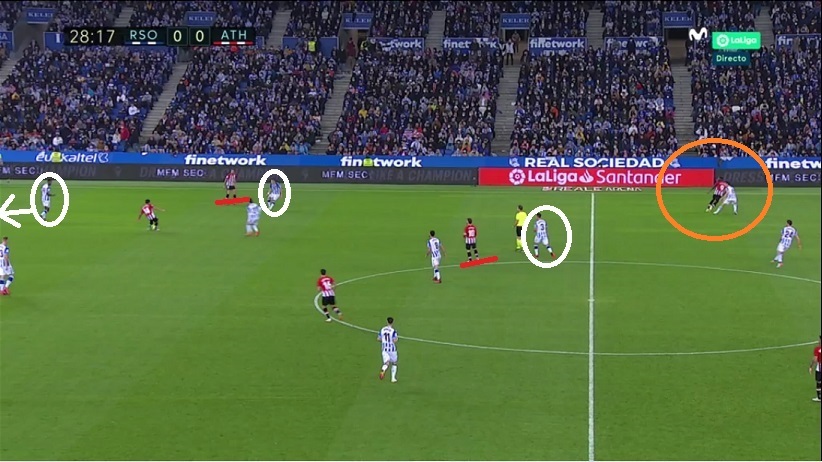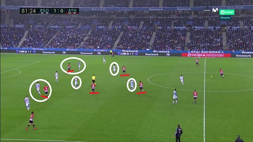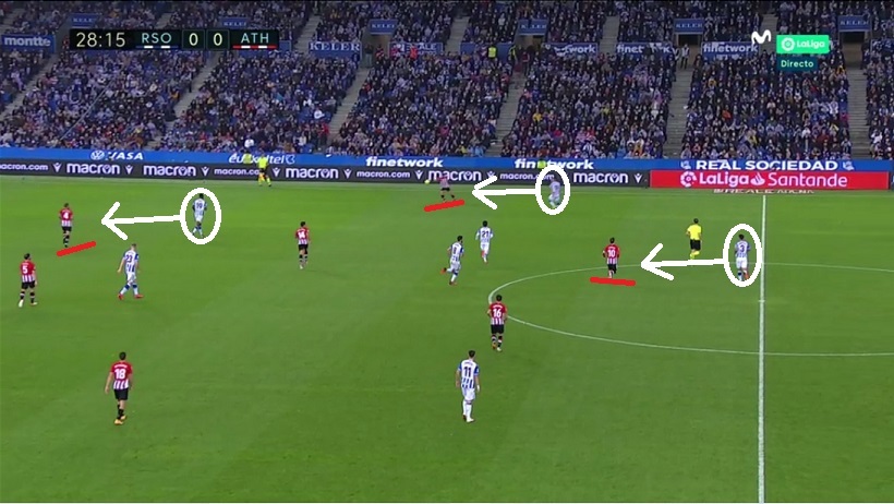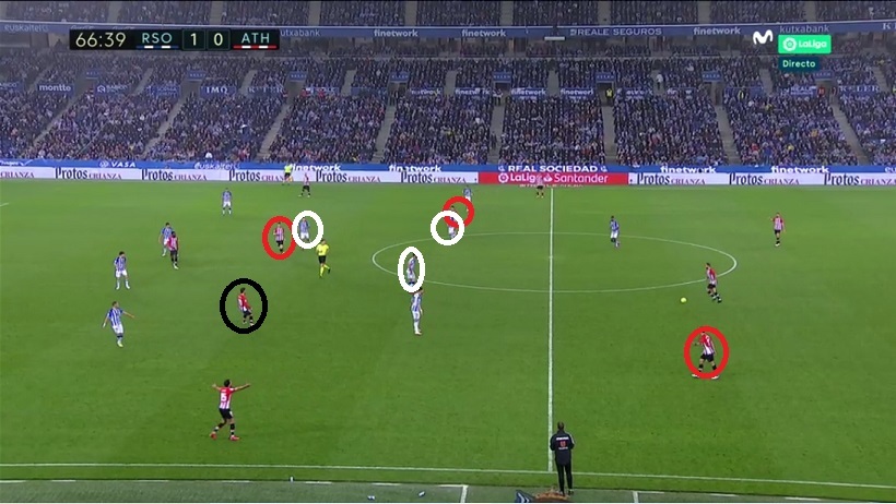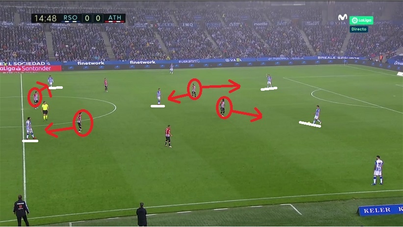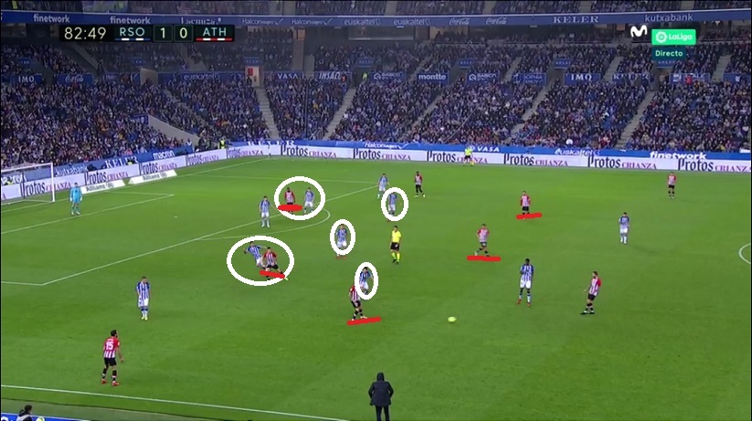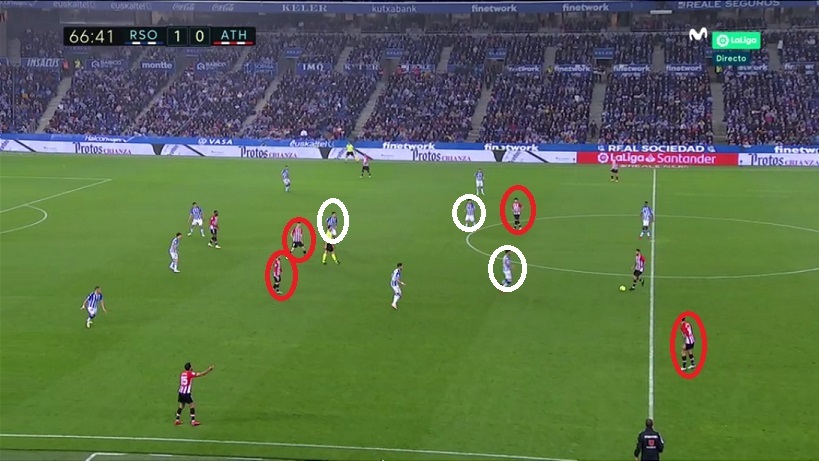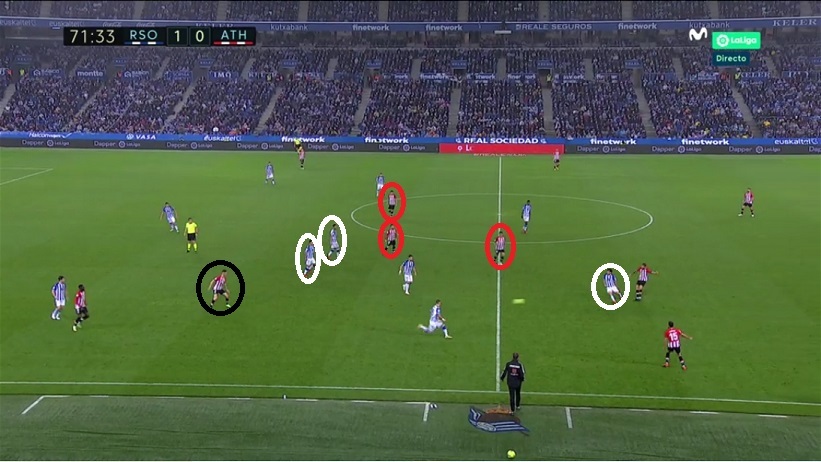 La Real controló bien así el juego interior del Athletic. Se aprecia de nuevo en esta imagen, que sin embargo luego recuperaremos para observar también cómo aprovecharon el panorama los de Marcelino.