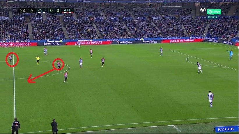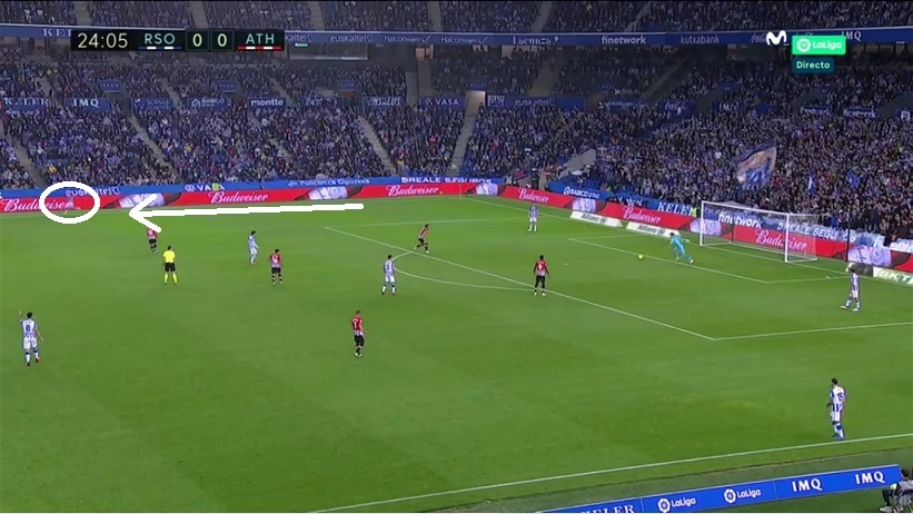 Marcelino demostró tener prevista esta situación y el juego en largo con Williams fue una constante. El Athletic lo intentó una y otra vez, generando oportunidades ante Remiro. En esta imagen marcamos la posición siempre alta de Gorosabel, a cuya espalda sufrió mucho la Real .