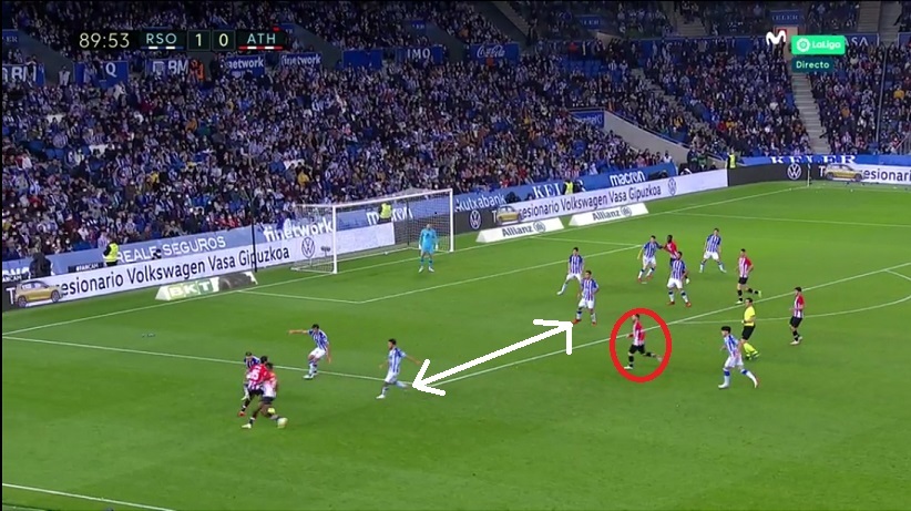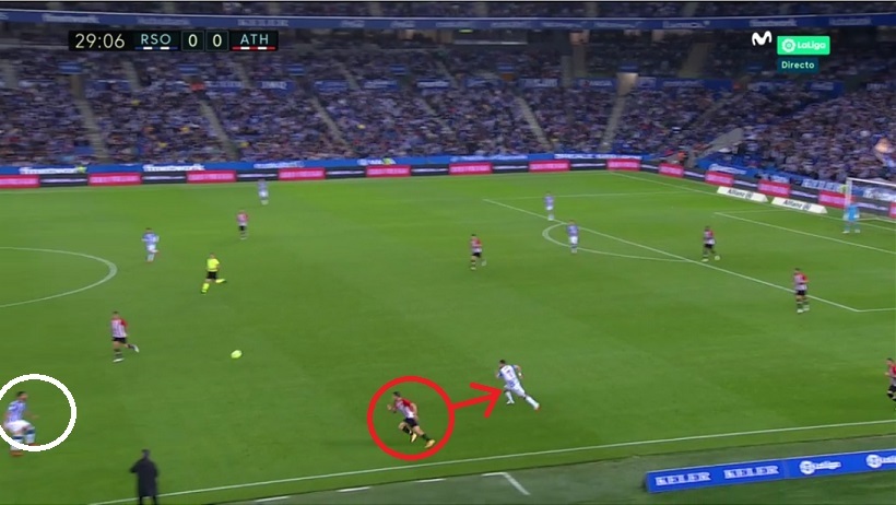 El Athletic mostró incluso un mecanismo de protección según el cual Vencedor dejaba la presión y se retrasaba a doble pivote con Dani García cuando la Real superaba el bloque alto visitante (en la imagen lo había hecho desde Gorosabel). Se vio un partido bastante cerrado.