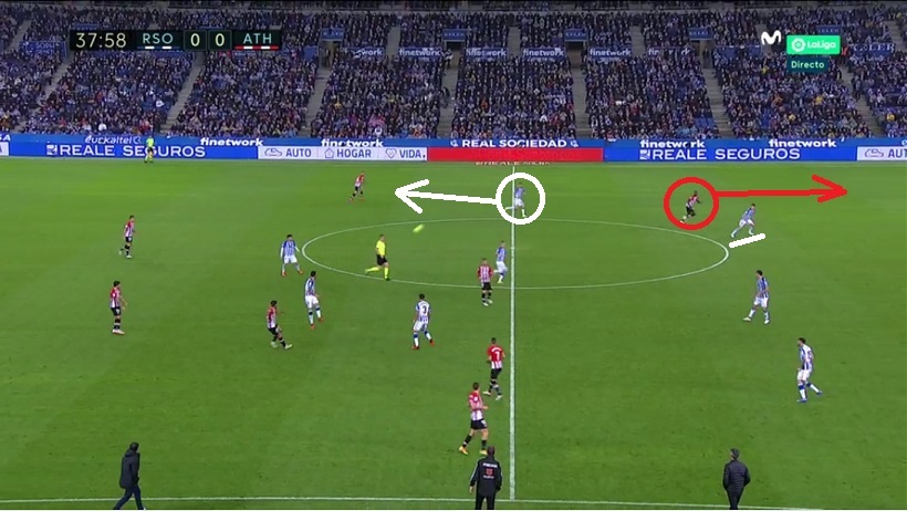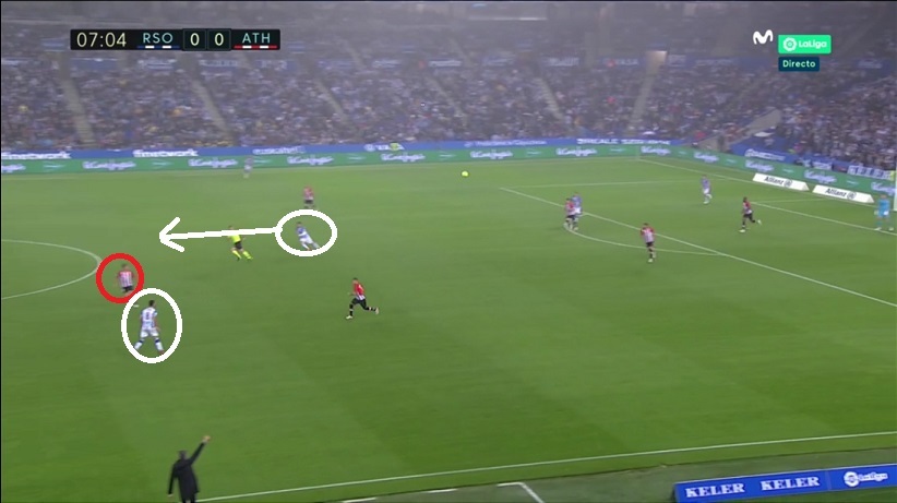 Buena reacción de Marcelino. Tras el gol dio entrada a Sancet, quien complicó las cosas a la Real doblando esa amenaza interior de Muniain. Zubimendi vio moverse a ambos en su zona dentro de un tres contra cuatro.