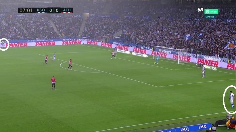Pero no fue un derbi tan hermético como el del pasado curso en Anoeta. La Real, por ejemplo, supo forzar algunas presiones altas para superarlas y encontrar superioridades. ¿Cómo? Estirando y ensanchando el campo. En la siguiente imagen vemos a los laterales bajísimos.