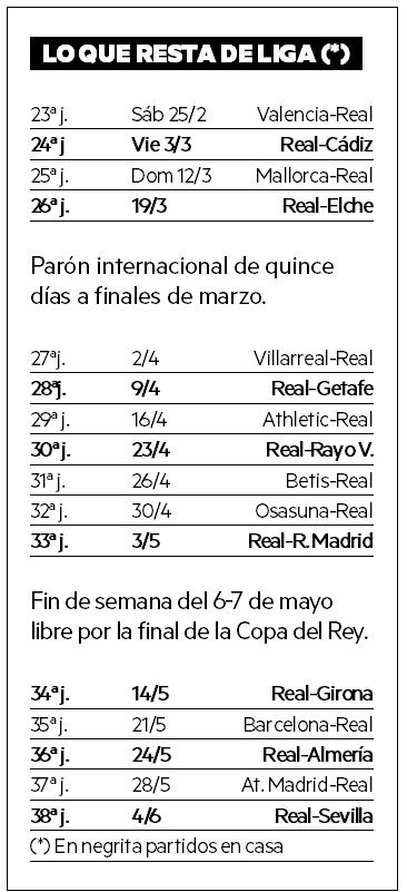 Siempre sobre el papel, los partidos de la primera vuelta contaron en líneas generales con una dificultad mayor en Anoeta que a domicilio. En el segundo turno, mientras, parece suceder todo lo contrario, aunque esta es una circunstancia que afectaba ya a los dos primeros compromisos ante Valladolid y Celta (solo un punto sumado de seis posibles). En el horizonte esperan en el estadio donostiarra, por este orden, las visitas de Cádiz, Elche, Getafe, Rayo Vallecano, Real Madrid, Girona, Almería y Sevilla, una agenda a priori amable, en líneas generales, para revertir la estadística actual y sumar varias victorias más en casa.
