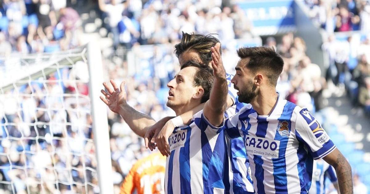 Oyarzabal celebra con Kubo y Brais su gol al Celta.