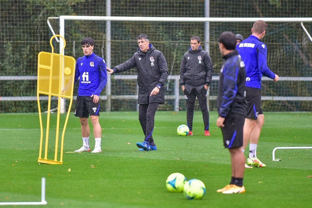 Imanol dirige la sesión de esta mañana en Zubieta. Foto: Arnaitz Rubio Del filial txuri-urdin se caen el portero Unai Marrero y el extremo Valera, que anoche también dispuso de sus minutos en el choque de Anoeta ante Las Palmas.