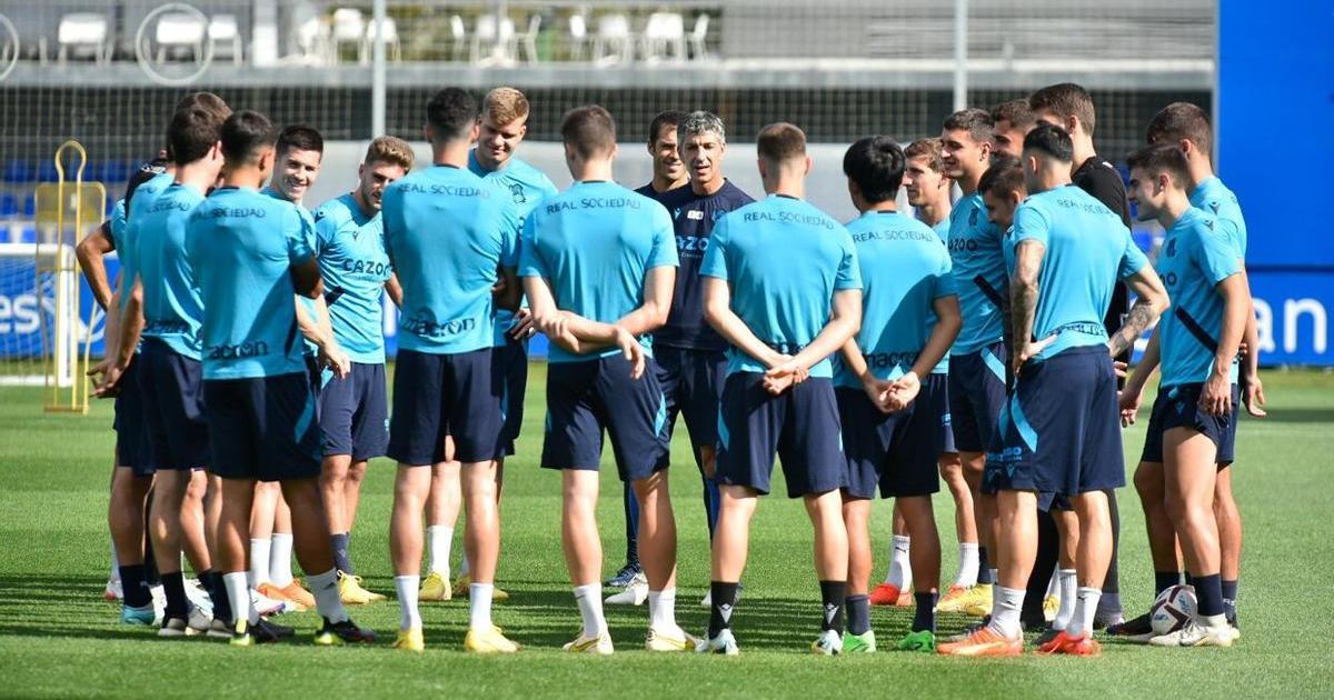 Imanol Alguacil se dirige a sus futbolistas durante un entrenamiento en Zubieta.