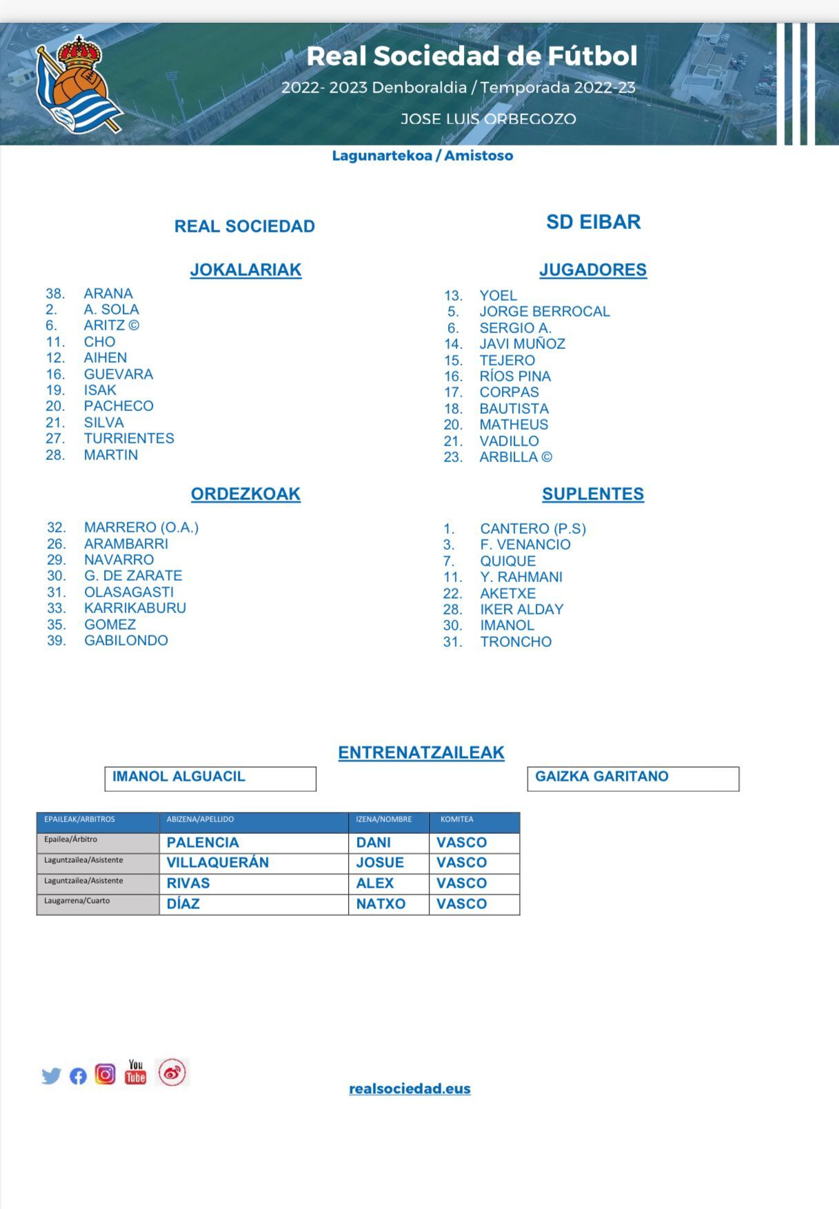El equipo de Imanol arrancará de Inicio con Arana en portería. La defensa estará compuesta por Gabilondo (que a última hora ha sustituido a Alex Sola que se ha lesionado en el calentamiento), Aritz, Pacheco y Aihen, mientras que en el centro del campo actuarán Guevara, Turrientes, Martín y Silva. Arriba, formarán Cho e Isak.