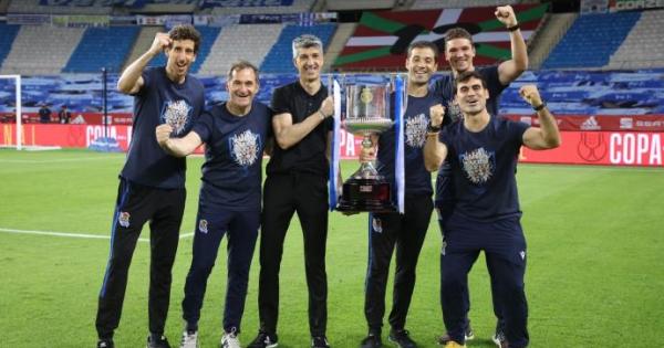 Donostia – Tan importante o más que los jugadores en la consecución de un título lo son los integrantes de su cuerpo técnico. El equipo que colabora con Imanol Alguacil para que la plantilla desarrolle los planteamientos elaborados para ganar los partidos que pueden desembocar en un éxito como el de la consecución de la Copa. Imanol no solo está respaldado en el banquillo por Mikel Labaka, sino que cuenta con un grupo de ayudantes de primer nivel. En la imagen que acompaña a esta información aparecen los colaboradores que estuvieron presentes en La Cartuja (de izquierda a derecha): Beñat Labaien, integrante de la Estructura de Análisis; Luis Llopis, preparador de porteros que el próximo curso recalará en el Real Madrid, en la Estructura Técnico Táctica; Imanol, el capitán de la nave, que sujeta la Copa junto a Labaka, su más inmediato colaborador; Jon Ansotegi, también exfutbolista txuri-urdin como el azpeitiarra, perteneciente a la Estructura Técnico Táctica; e Ibon Peñagarikano, de la Estructura de Análisis. A estos hay que añadir a David Casamichana e Iñigo Almandoz, de la Estructura Condicional.