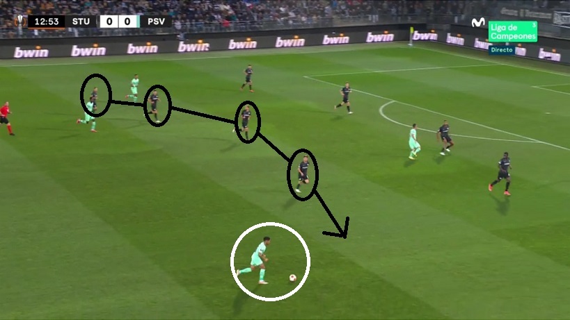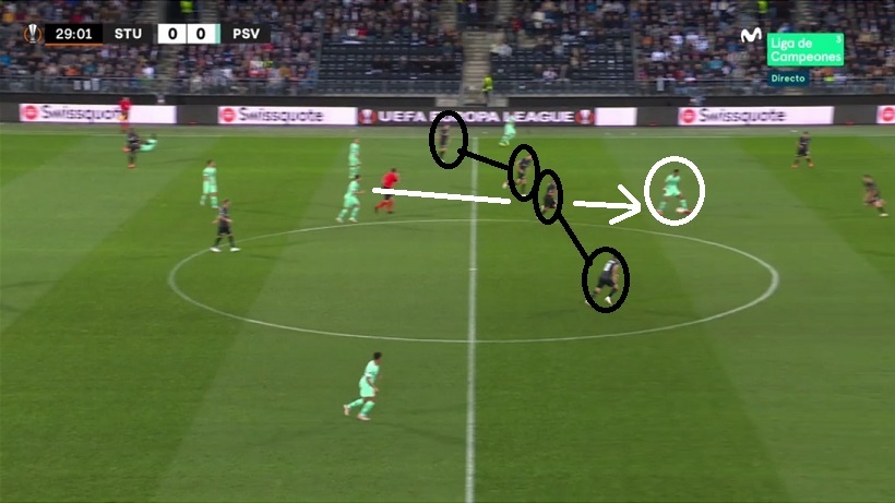 El PSV, mientras, supo orientar el rombo del Sturm a los costados, para encontrar al hombre libre en la banda opuesta y hacer mucho daño desde ese punto de partida...