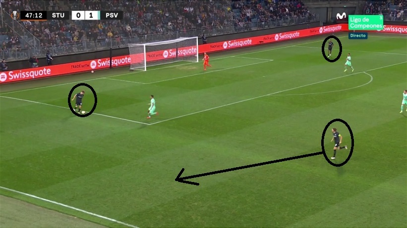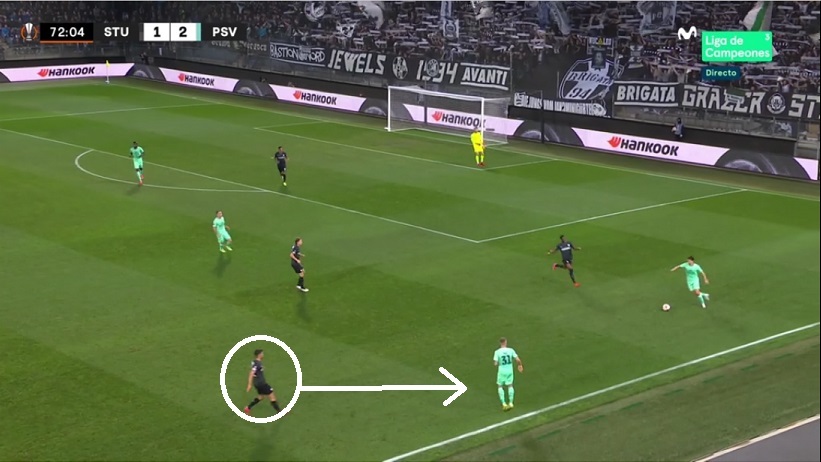 Desde una versión más auténtica, y pese a recibir el 0-2 a la contra, el Sturm hizo el 1-2 y mereció empatar. Le sentenciaron luego con el 1-3, fruto de los riesgos en la presión: salta muy arriba el lateral (círculo blanco) y se genera un ataque del PSV que termina en córner y gol.