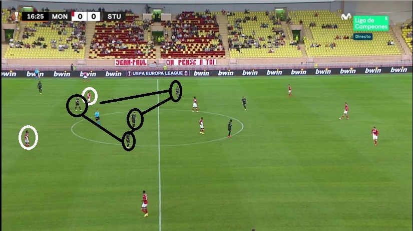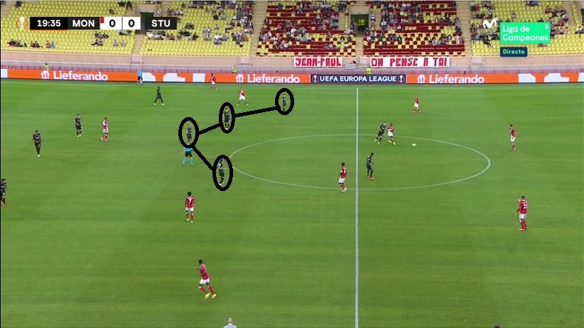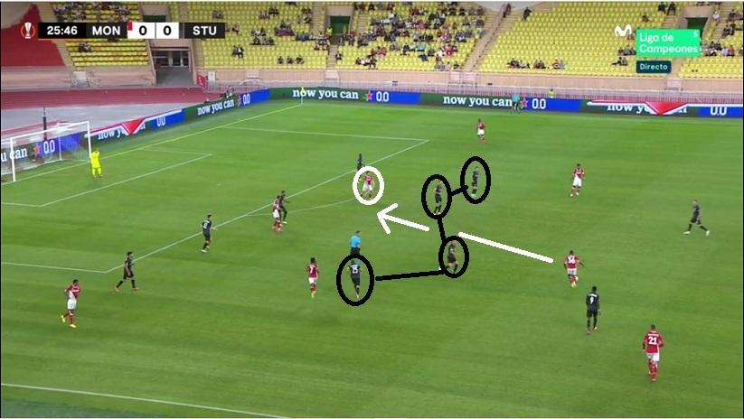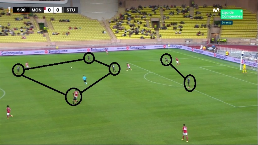 Pero los rivales de la liguilla le están llevando a cambiar sobre la marcha. El Mónaco recurrió a su habitual 3-4-2-1 e hizo daño al Sturm ubicando a Gelson y a Volland a los costados del pivote Stankovic...