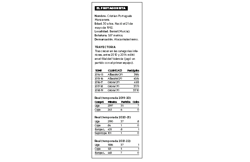 El parón del covid vino a significar un punto de inflexión para el juego de la Real y para Portu. Aquella Liga exprés de verano de 2020, con jornadas cada tres días, perjudicó al ritmo de los partidos. Malo para el murciano. Y el equipo se vio además con un estatus adquirido que redundó en la actitud de los rivales, más respetuosos y propensos al repliegue. Igualmente malo para el murciano, cada vez con menos metros para correr. Si a todo ello le sumamos el relevo en la mediapunta de Silva por Odegaard y el modo en que este afectó al fútbol del equipo, ya algo distinto, comienza a entenderse por qué el protagonismo de Portu ha ido descendiendo de forma paulatina en los dos últimos años, sobre todo en el más reciente.