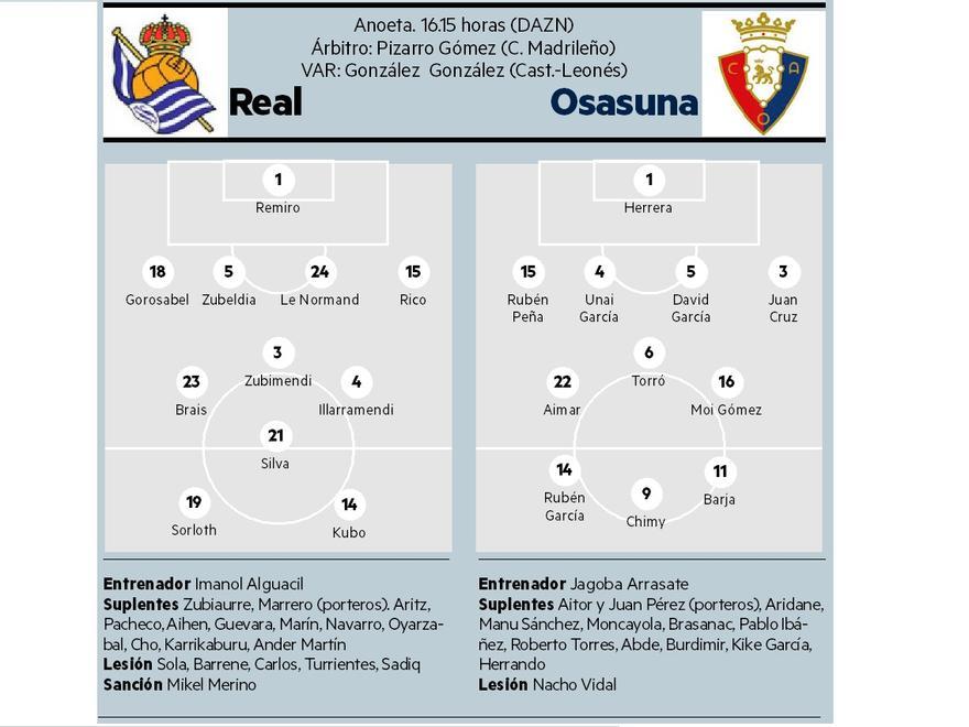 Los txuri-urdin, sin el sancionado Mikel Merino pero con los regresos de Oyarzabal y Aihen, reciben a un complicado rival ante el que Imanol puede mantener el 4-3-3 o regresar al 4-4-2