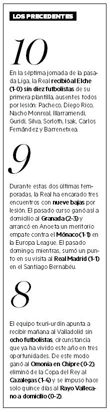 La lista de bajas con la que la Real Sociedad recibirá este domingo al Valladolid (Anoeta, 18.30 horas) produce vértigo a cualquiera. El cuadro txuri-urdin no puede contar con ocho futbolistas de su primera plantilla, todos lesionados, y eso que las dudas iniciales respecto a Barrenetxea y Momo Cho resultaban muy susceptibles de elevar la nómina a diez. Sea como sea, la historia reciente del equipo de Imanol ofrece motivos para la esperanza. El pico máximo de ausencias en la pasada temporada ascendió precisamente hasta las diez, de cara al duelo de la séptima jornada en Anoeta contra el Elche. Y el cuadro txuri-urdin fue entonces capaz de adaptarse a las circunstancias y sumar tres puntos muy valiosos (1-0), gracias a un solitario gol de Mikel Oyarzabal.