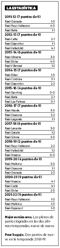 Rebobinar hasta el recordado ascenso de 2010 y analizar los resultados cosechados por la Real en este tipo de encuentros ratifica dos circunstancias: no es sencillo vencerlos y el equipo vive el mejor momento de su historia reciente (también en este sentido). Durante la última década han escaseado los plenos de victorias en casa (tres de tres) ante los conjuntos procedentes de Segunda. Solo se han dado dos, y ambos corresponden a las dos últimas temporadas. En el curso 2020-21, el que se celebró íntegro a puerta cerrada, el equipo de Imanol superó como local a Huesca (4-1), Cádiz (4-1) y Elche (2-0). La pasada campaña, ya con público en la grada, se repitió la buena serie frente a Rayo Vallecano, Mallorca y Espanyol.