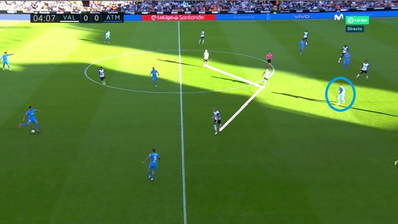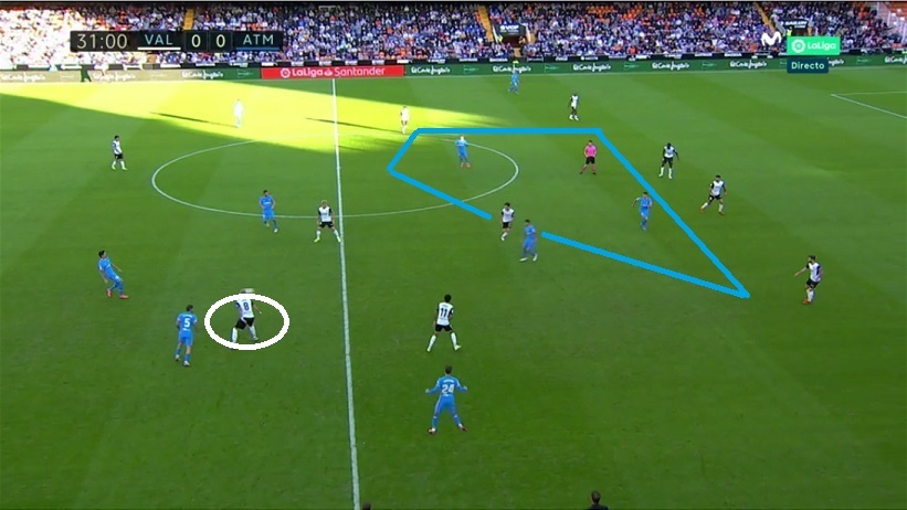 Y el Valencia repitió funcionamiento una semana después contra el Atlético de Madrid (azul recibe también a espalda-costado de Guillamón).