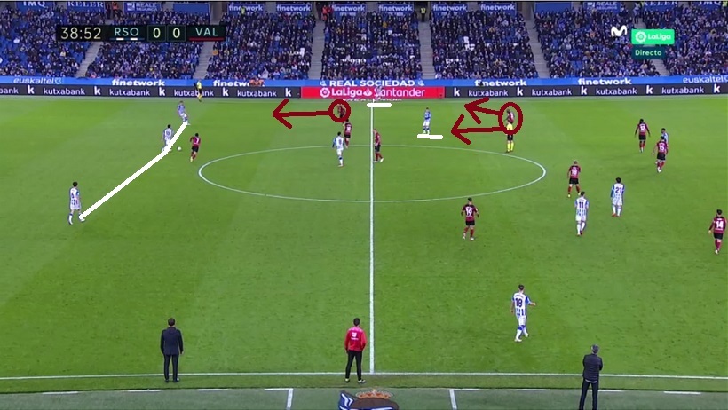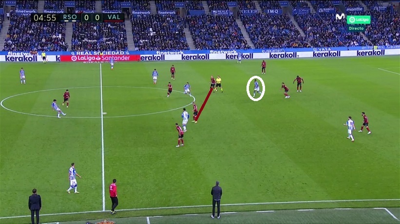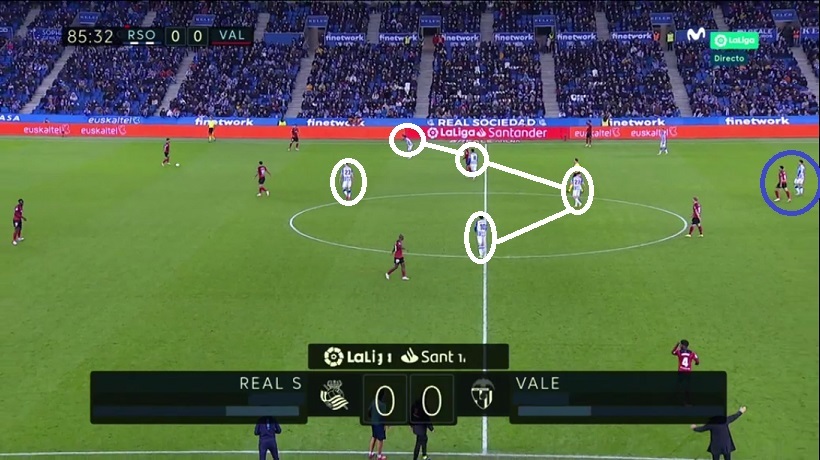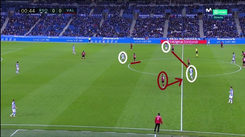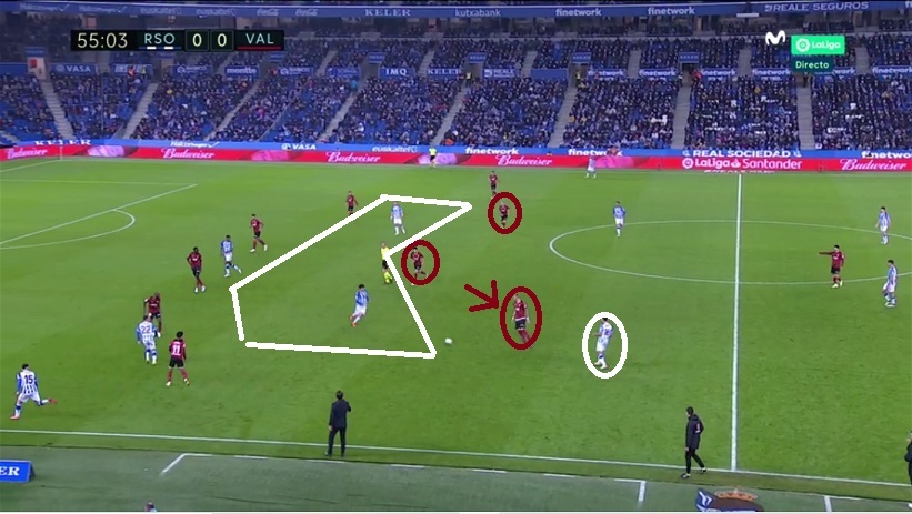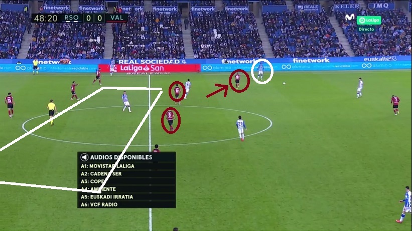 Sin embargo en Anoeta, manteniendo la idea, Bordalás se adaptó a la estructura de la Real apostando por un doble pivote Wass-Racic con Carlos Soler por delante. Emparejó a Soler con Guevara, a Racic con Silva y a Wass con Merino. Además, el extremo del ladó débil (Hugo Duro, círculo) basculaba para ayudar dentro.