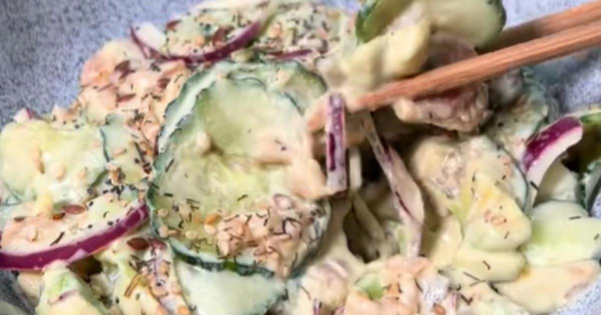 Se trata de una ensalada de pepino, salmón y queso crema, una mezcla de ingredientes básicos que logra un sabor intenso y una textura cremosa con apenas unos minutos de preparación. El influencer empieza cortando un pepino entero en rodajas finas, añade un cuarto de cebolla morada y mezcla ambos ingredientes en un bol. “Estoy haciendo la icónica ensalada de pepino, salmón y queso crema,” explica mientras incorpora salmón ahumado picado y queso crema con cebollino.