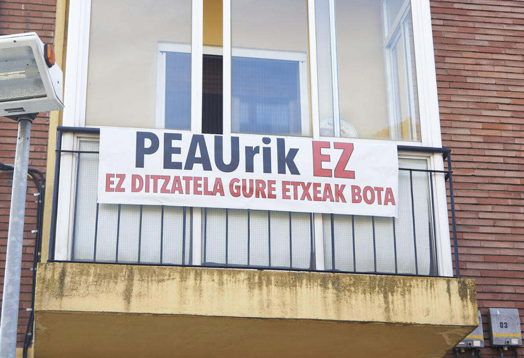 Pancartas en otro de los edificios del barrio. "Lo que no pueden pretender es que los vecinos acepten un acuerdo que es perjudicial para ellos con el argumento de que es bueno para el barrio. Todos queremos que mejoren las condiciones de vida de la Milagrosa, pero no así", señaló Patxi Goñi.