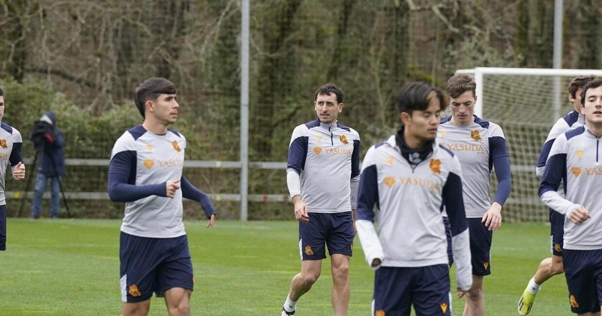 Mikel Oyarzabal, durante el entrenamiento de este lunes junto a varios compañeros. / RUBEN PLAZA