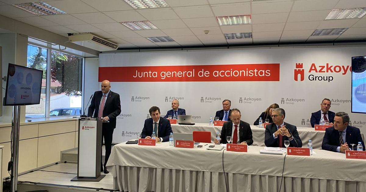 Eduardo Unzu, a la izquierda, durante su intervención en la Junta de Accionistas de Azkoyen