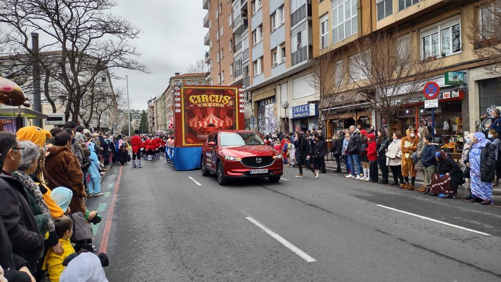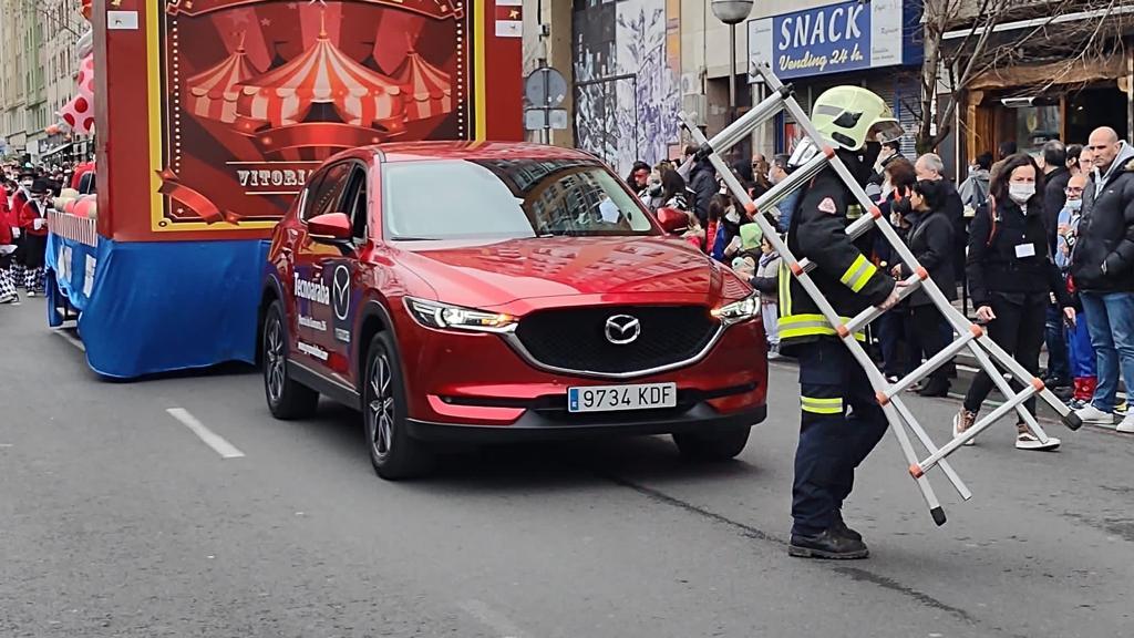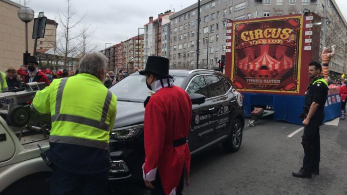 El coche ha sido sustituido y el desfile ha reanudado su marcha por las calles de la capital alavesa, donde esperaban miles de vitorianos para ver los disfraces y animar a las comparsas en el recorrido hasta la Plaza de la Constutción en El Pilar.