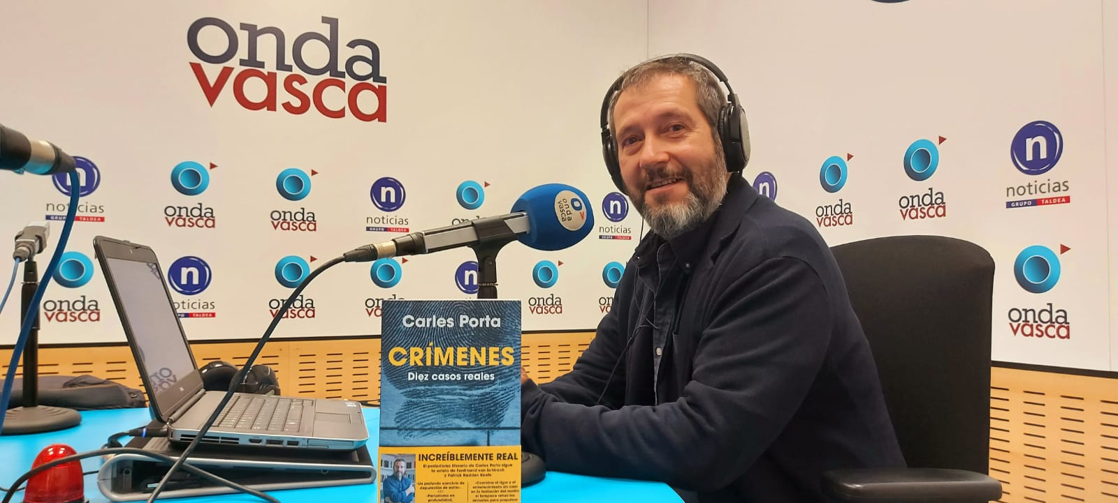 El periodista Carles Porta visita Onda Vasca para presentar "Crímenes. Diez casos reales", Supone llevar la fórmula radiofónica y visual al terreno del papel, historias elegidas por su impacto social, perfil, resolución . . . entre ellas el asesinato en 2011 de Amaia Azkue en Zarautz.