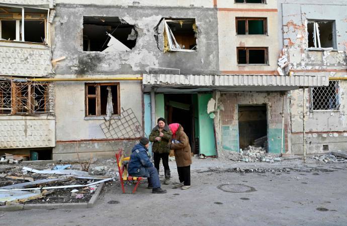 Tres personas charlan ante un edificio destrozado en Jarkóv. AFP Escepticismo en Ucrania y en occidente