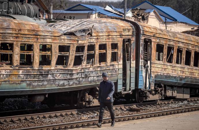 Un hombre pasea junto a los restos de un tren en Trostianets. AFP Los separatistas prorrusos, aseguraron hoy que han liberado más de la mitad del territorio de la autoproclamada república de Donetsk, entre un 55 % y un 60 %, según dijo su líder, Denis Pushilin, en la cadena de televisión estatal rusa Rossiya 1.