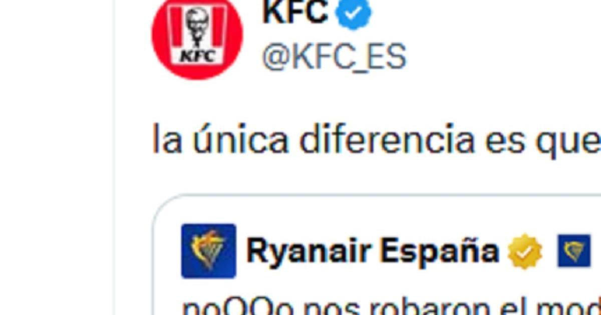 Ha pasado este jueves entre las cuentas oficiales de dos empresas que en principio no tienen mucho que ver: la aerolínea Ryanair, muy conocida en la red antes conocida como Twitter por su tono burlón e incluso agresivo, y Kentucky Fried Chicken (KFC), firma de comida rápida especializada en pollo frito y que también es muy irreverente en X. Esta última subía un tuit el miércoles en el que ponía lo siguiente: “KFC ofrecerá pollo frito a cambio de dinero”, ilustrando el texto con fotos de pollo frito y dinero.